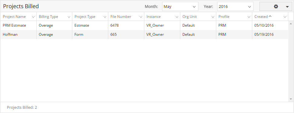 Underneath the Purchased Transactions section is the Projects Billed table. The projects are filtered by month and year. You can select the month and year of the projects that you want to see in the upper right corner of this section. Each project is accompanied by its Billing Type, Project Type, File Number, Instance, Org Unit, Profile, and Created date.