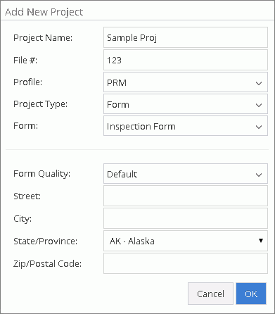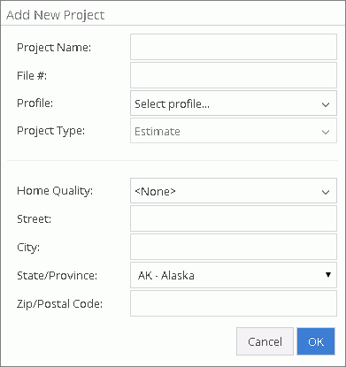 Enter a Project name and a File # for your project, then select a Profile from the dropdown. If a particular profile is greyed out in the dropdown list it is locked by the profile owner and therefore not available. Select a Project Type from the dropdown. The project type will be either Estimate or Form. If only Estimate is showing, Form is not available in the selected profile. If Form is selected, an additional Form dropdown field will appear.