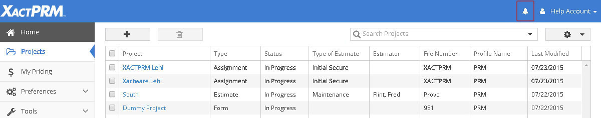 The Projects window has columns that display the Project Name, Type, Status, Type of Estimate, Estimator, File Number, Profile Name, and the Last Modified Date for each of the created projects. These projects can be sorted by clicking on the various column headings. Projects that are shown as bold are either assignments that were created in XactPRM Analytics, but have not yet been opened, or a duplicate, that has not yet been opened, of an existing project . Once an assignment is opened and an Estimator is selected in the Project Info screen, the Estimator will be automatically populated with that selection and the project will no longer be shown as bold. To Rename, Duplicate, Copy, Reassign, Filter, or Print a particular project from this screen, see the Project Options Cog. This main project screen also shows the little New Feature icon.