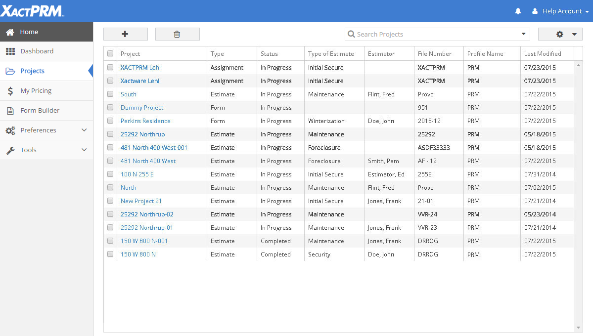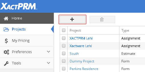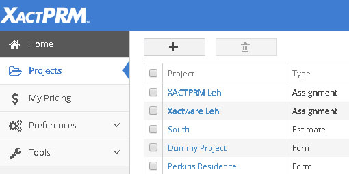 The Type column will show one of three types: Estimate - for any estimate that was created in XactPRM, Form - for a form that was created in XactPRM, or Assignment - for an estimate that was created in XactPRM Analytics.