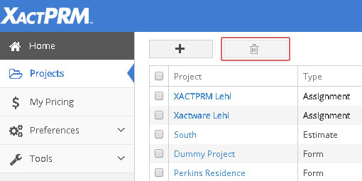 Check the box adjacent to the project(s) you wish to delete and then click the delete button in the upper left corner of the Projects window.