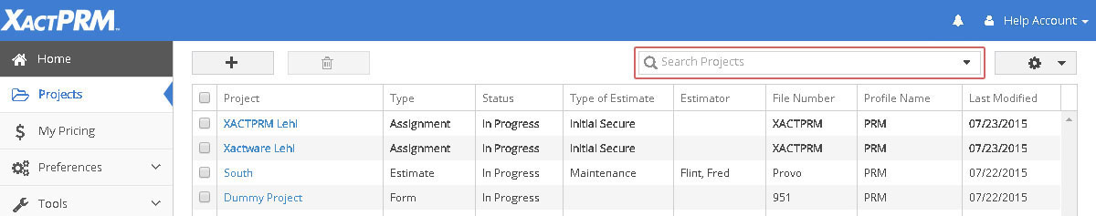The Search Project feature allows you to type in a specific word or part of a word and the Project list will filter on all of the projects that contain what was typed. The project search will search in any of the columns to find the matching criteria. The Search Project feature can be found in the top right portion of the project dashboard.
