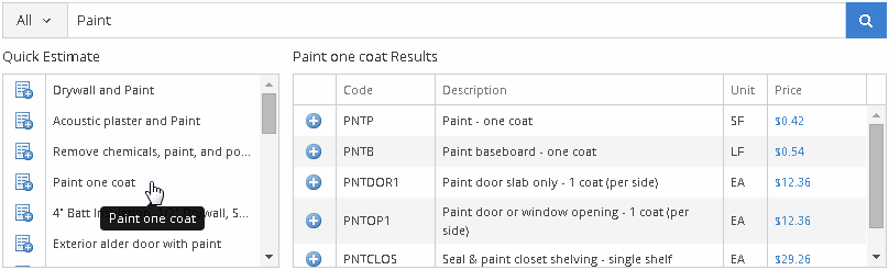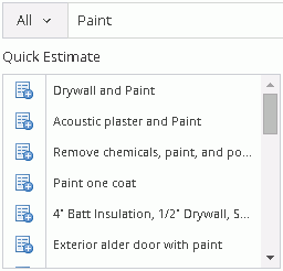 For the above image, “Paint” is the keyword in the Estimate Search and the items showing in the Quick Estimate area are the quick estimates that relate to paint. Quick estimates contain one or more line items that can be added to the estimate all at one time. To see what line items a quick estimate contains, click on the name, and the items contained in that quick estimate will be displayed in grid to the right of the Quick Estimate grid.