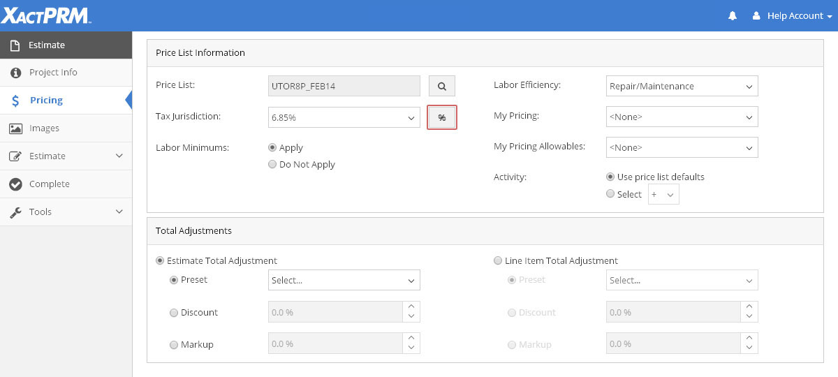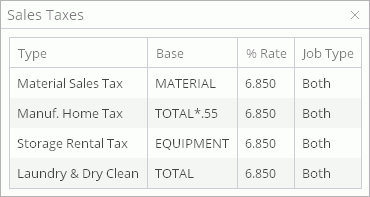 Click on the '%' button. A new pop-up will open, displaying the sales tax items that apply for the price list that has been selected and according to the tax jurisdiction selected.