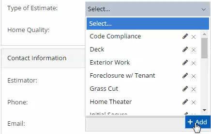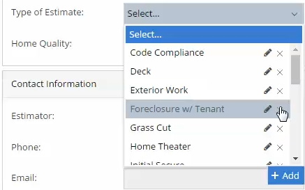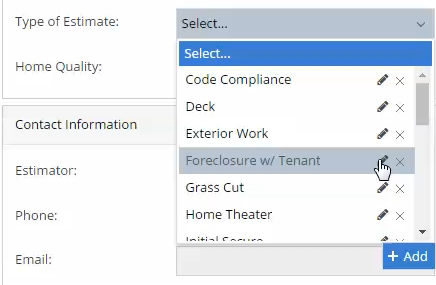 When clicking on the Type of Estimate dropdown, a smartlist of pre-populated types will be displayed. From there you can select an existing type, create a new type, or edit an existing type.