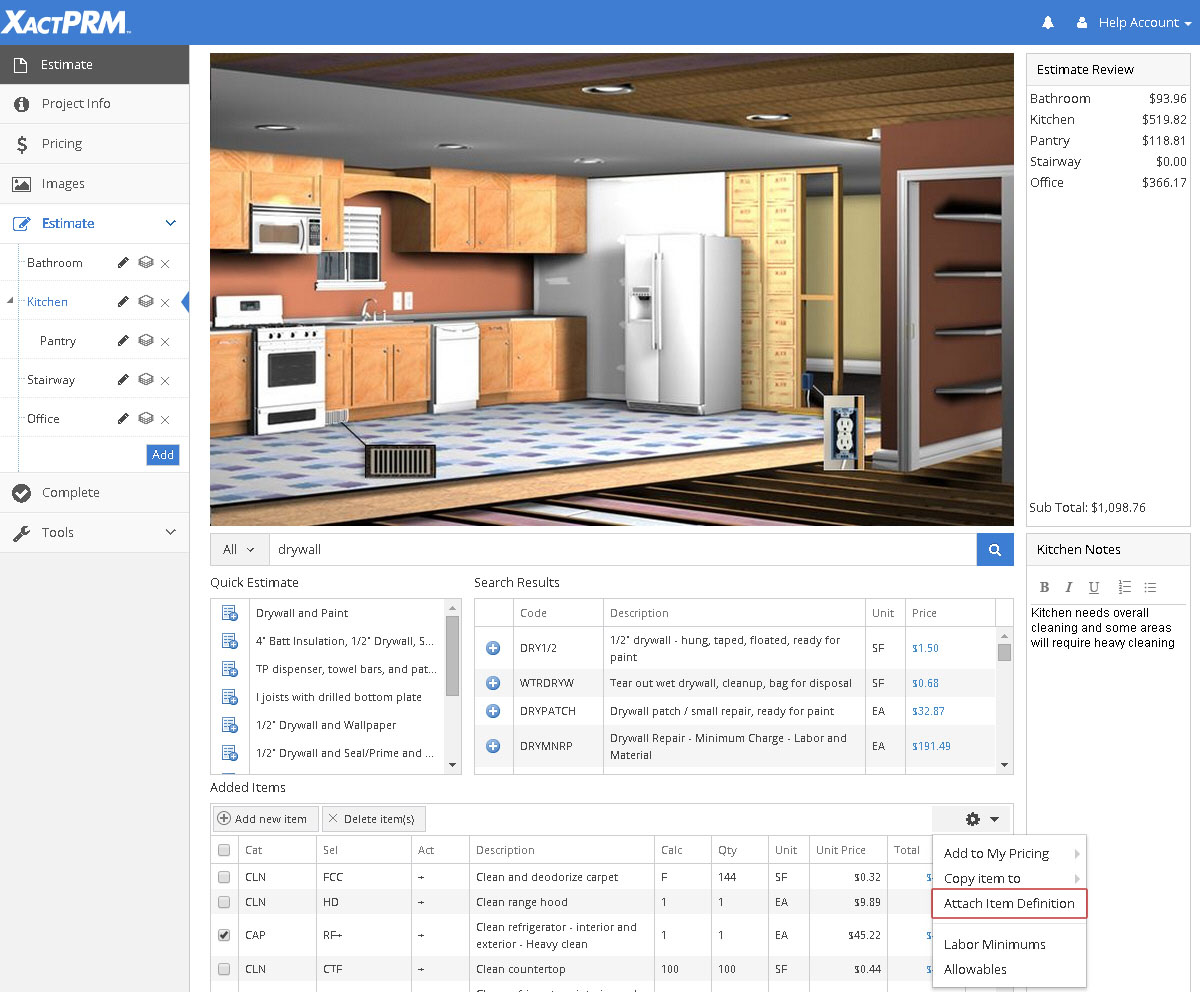 Attach Item Definition allows the user to add a line item note, that is the actual definition of the line item, to the item as an attached note. If you want to just add a custom note of your own making, see the "To add a line item note" portion of Added Items. The Attach Line Definition can be found in the Estimate tab within a project, in the Estimate Options cog, located in the Added Items section.