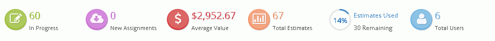 The Dashboard is available for those that have administration access. This screen shows at a glance the total number of estimates. Of those estimates, how many are In Progress, New Assignments, what the Average Value is for all of the estimates, and how many Total Users are part of the instance.