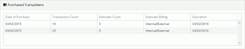 In the Purchased Transactions section, you can see a snapshot of the number of pre-paid transactions that have been purchased, when those were purchased, how many have been used and when that set of pre-paid transactions expires.